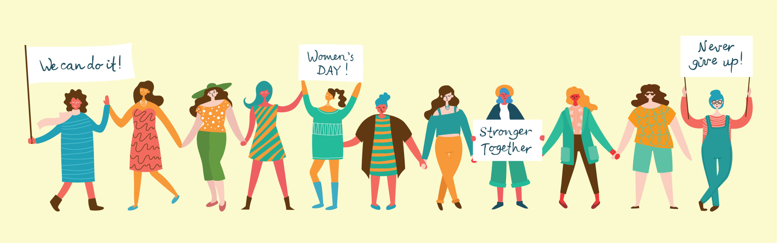 Colorful vector illustrations concept of Happy Woman’s internarional day . Happy female friends, union of feminists, sisterhood holding the placard in flat design