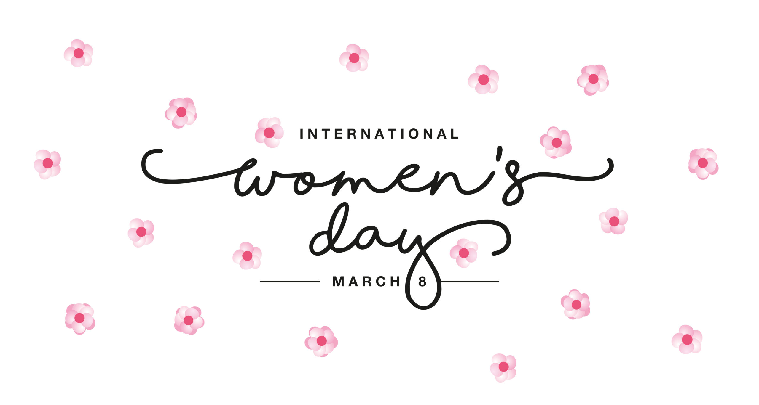 International Women’s Day handwritten typography lettering pink flowers white background greeting card